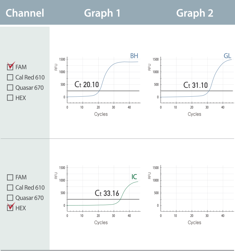 Das Ergebnis repräsentiert im FAM-Kanal eine Co-Infektion mit B. hominis (BH) und G. Iamblia (GL) mit Ct-Werten von 20,10 (Graph 1) bzw. 31,10 (Graph 2).