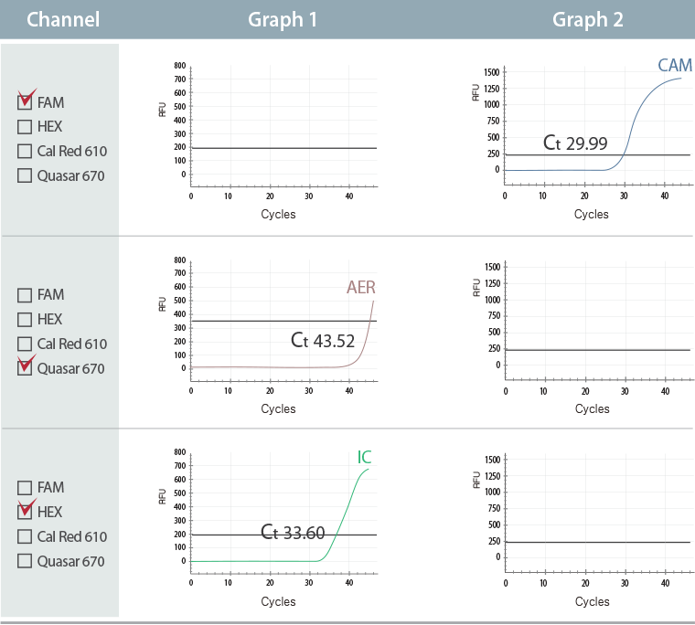 Das Ergebnis des Allplex™ GI-Bacteria(I) Assay zeigt eine Co-Infektion mit Campylobacter spp. mit einem Ct-Wert von 29,99 (Graph 2) im FAM-Farbkanal und Aeromonas spp. mit einem Ct-Wert von 43,52 (Graph 1) im Farbkanal Quasar 670.