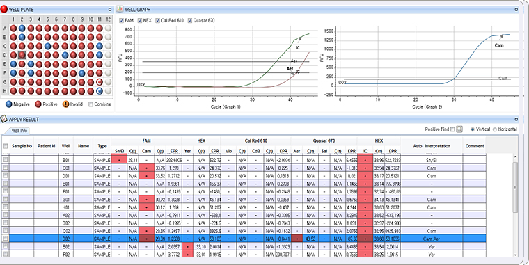 Allplex™ GI-Bacteria(I) Assay ist eine einschrittige Multiplex-Echtzeit-RT-PCR zur Detektion und Identifizierung von 7 bakteriellen Erregerpathogenen für Infektionen des gastrointestinalen Trakts. Dieser Assay, der auf der urheberrechtlich geschützten MuDT™-Technologie von Seegene beruht, meldet die verschiedenen Ct-Werte der einzelnen Pathogene in einem einzigen Farbkanal des Echtzeit-PCR-Geräts.