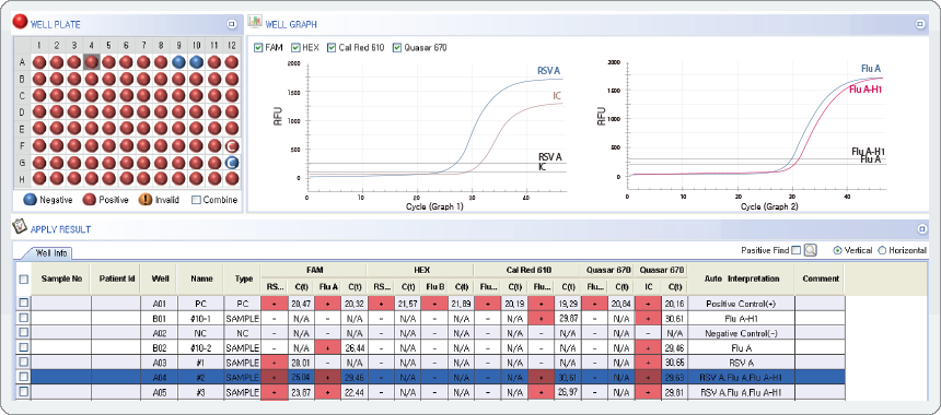Das Ergebnis repräsentiert im FAM-Kanal eine Co-Infektion mit RSV A und Influenza A mit Ct-Werten von 26,04 (Graph 1) bzw. 29,46 (Graph 2). Darüber hinaus zeigt das Ergebnis der Influenza-A-Subtypisierung gleichzeitig eine Infektion mit Influenza A-H1 mit einem Ct-Wert von 30,61 (Graph 2) im Farbkanal Cal Red 610. Durch Analyse der einzelnen Ct-Werte in Graph 1 und Graph 2 gibt der Assay Allplex™ Respiratory Panel 1 quantitative Informationen zu vielen verschiedenen Pathogenen aus.