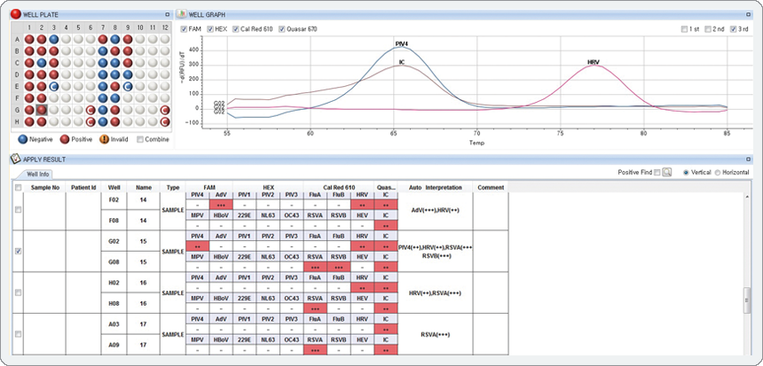 Anyplex™ RV16 Detection detektiert und differenziert 16 der am weitesten verbreiteten respiratorischen Viren, die derzeit im klinischen Bereich bekannt sind. Dieser Assay wird mithilfe der urheberrechtlich geschützten Technologien DPO™ und TOCE™ von Seegene auf Multiplex-Echtzeit-PCR-Geräten durchgeführt und stellt durch einen einzigen Test Infektionsdaten zu 16 respiratorischen Viren mit hoher Sensitivität und Spezifität bereit.