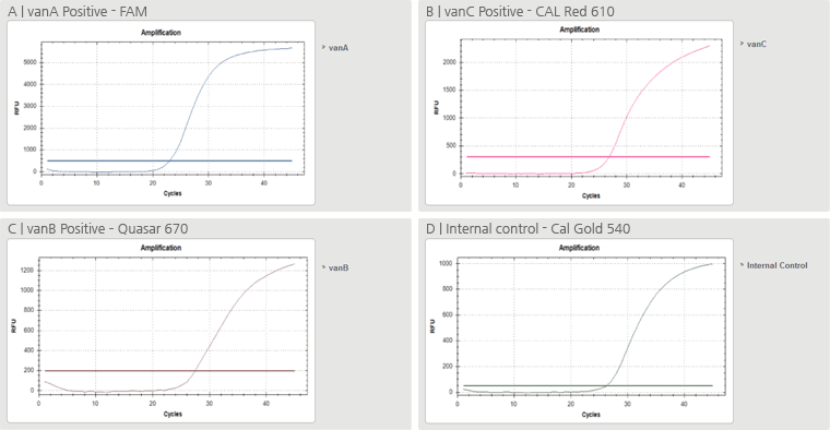 Die Ergebnisse zeigen mithilfe des Echtzeit-PCR-Geräts CFX96 gewonnene positive Ergebnisse für vanA, vanB und vanC.